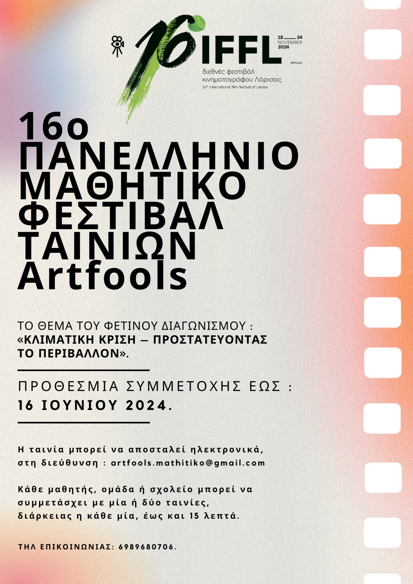 Ξεκινούν οι υποβολές για το 16 ο Πανελλήνιο Μαθητικό Φεστιβάλ ταινιών μικρού μήκους Λάρισας – Artfools, το οποίο διοργανώνεται κάθε