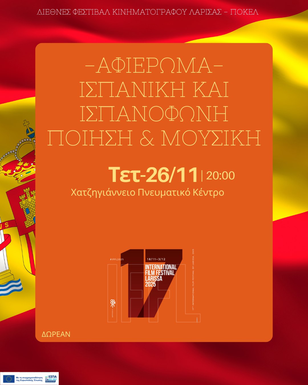 Αφιέρωμα στην Ισπανική και Ισπανόφωνη Ποίηση και Μουσική από το Διεθνές Φεστιβάλ Κινηματογράφου Λάρισας και το Πολιτιστικό Κέντρο Εκπαιδευτικών Ν. Λάρισας