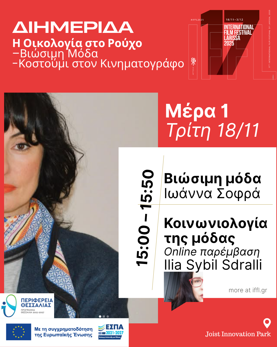 Στο πλαίσιο του 17ου Διεθνούς Φεστιβάλ Κινηματογράφου Λάρισας (IFFL) θα πραγματοποιηθεί από στις 18 και 19 Νοεμβρίου στο Πάρκο Καινοτομίας JOIST Διημερίδα με θέμα: Η Οικολογία στο Ρούχο – Βιώσιμη Μόδα και Κοστούμι στον Κινηματογράφο.